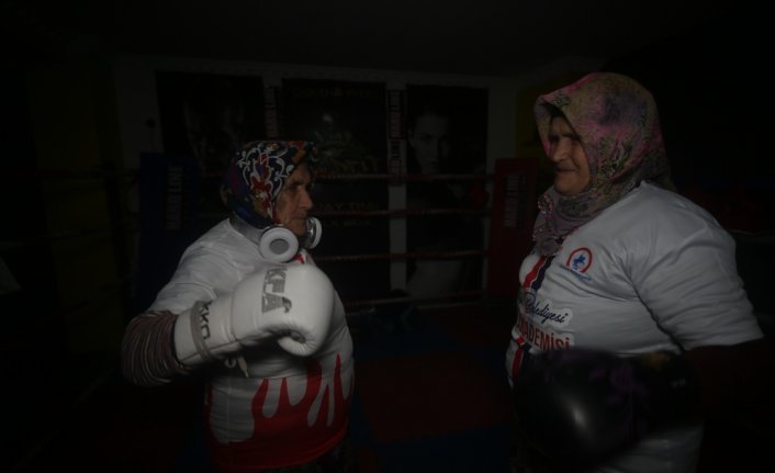 DÜZCE (AA) - ÖMER ÜRER - Düzce'de sağlıklı yaşam sürmek isteyen 57-85 yaş aralığındaki kadınlar, yöresel kıyafetlerini giyerek ellerine geçirdikleri boks eldiveniyle muay thai sporu yapıyor.