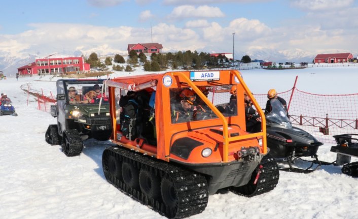 Tatbikatta, senaryo gereği çığ altında kalan 3 kişi yaralı halde kar altından çıkaran ekipler, ardından da yaralıları kar motoru ile ambulansa ulaştırdı.