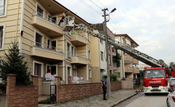DÜZCE (AA) - Düzce'de bir apartmanın üçüncü katındaki evlerinde mahsur kalan 8 yaşındaki çocuk ile kedisini itfaiye ekipleri kurtardı.