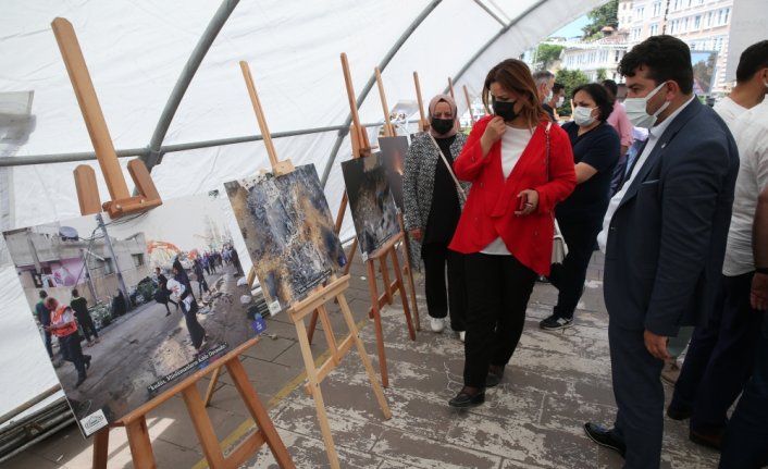 Atatürk Meydanı'nda açılan sergide, İsrail'in Gazze'de yaptığı bombalı saldırılar sonucu yaşanan son olayların fotoğrafları yer alıyor.