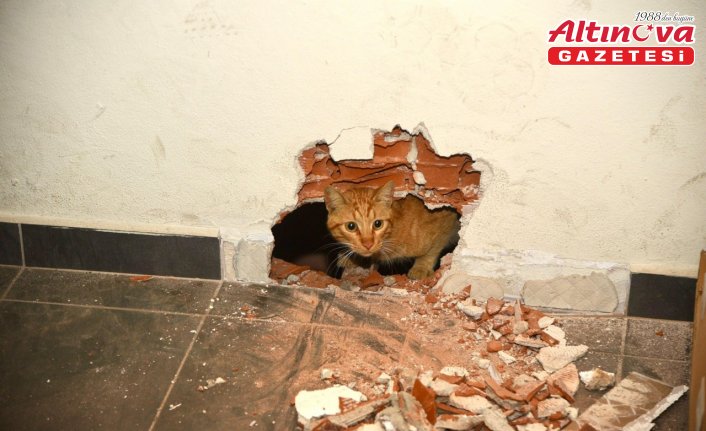 İhbar üzerine okula gelen itfaiye ekibi, kedinin bulunduğu yeri tespit ederek duvarı kırdı.