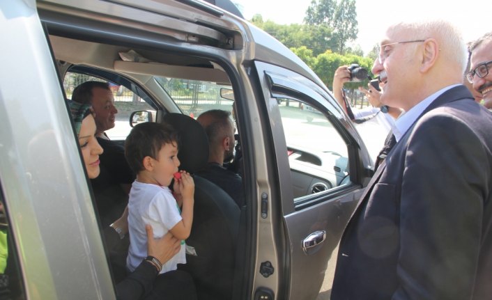 Sürücülerden trafik kurallarına uymalarını isteyen Erdil, çocuklara "kırmızı düdük" kampanyası kapsamında düdük ve tişört hediye etti.