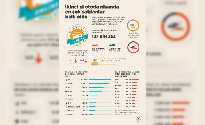 Bu yılın nisan ayında ikinci el online pazarda en çok tercih edilen otomotiv (binek ve hafif ticari) markası 20 bin 400 adetle VW oldu. Ardından 18 bin 582 adetle Renault, 13 bin 341 adetle Fiat sıralandı.