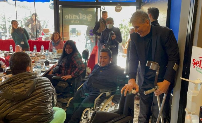 Yılmaz, daha sonra dernek üyesi Uğur Mutlu'ya tekerlekli sandalye sürprizi yaptı.