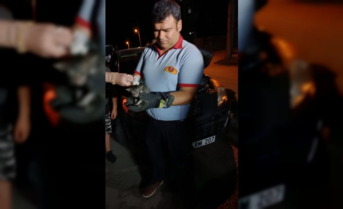 Çalışma başlatan ekipler, otomobilin motor kısmına sıkışan kedi yavrusunu bulunduğu yerden çıkardı.