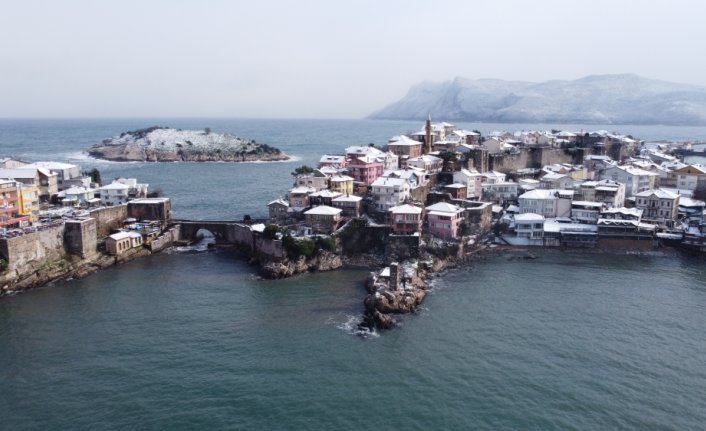 BARTIN (AA) - Amasra Kalesi ile 2015'te UNESCO Dünya Mirası Geçici Listesi'ne eklenen Bartın'ın Amasra ilçesi, kar yağışıyla beyaza büründü.