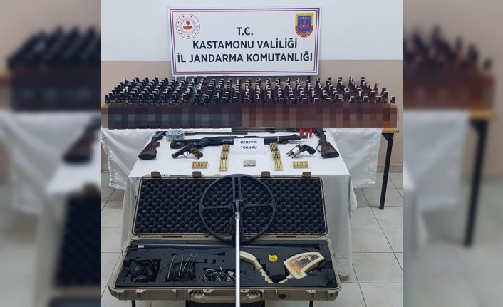 Aramalarda, bir litrelik 205 şişe kaçak içki ile ruhsatsız tabanca, 3 av tüfeği, kenevir tohumu ve dedektör ele geçirildi.