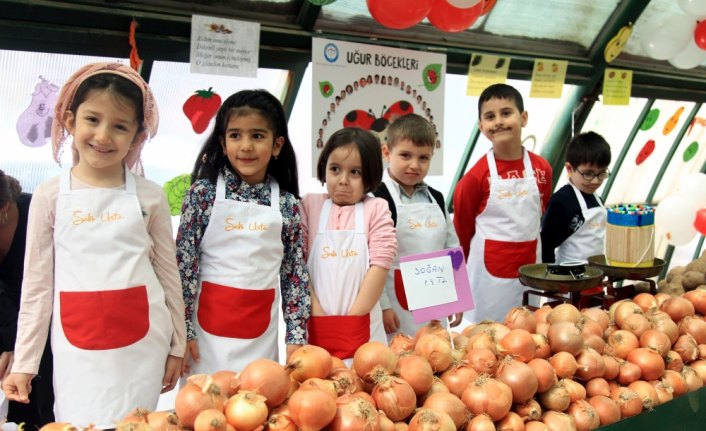Minik öğrenciler, pazarda meyve sebze ile kuru gıdalar sattı.
