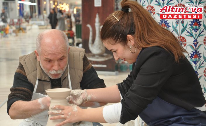Çarşı içerisinde oluşturulan alanda çark ustası çininin çamurdan yapım aşamasını yaptığı objelerle gösteriyor.