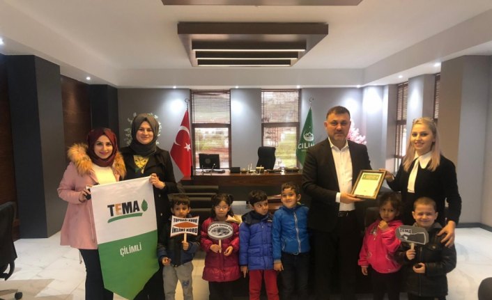 Çilimli anaokulu öğrencileri ve öğretmenleri, TEMA etkinliği kapsamında TEMA ilçe sorumlusu Nuray Eran Türedi eşliğinde Çilimli Belediye Başkanı Muhsin Yavuz'u ziyaret etti.