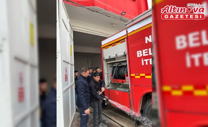 Öğrencilere itfaiye ekiplerince yangın söndürme çalışmaları, acil durumlarda yapılan müdahaleler ve kullanılan araçlar hakkında bilgi verildi.