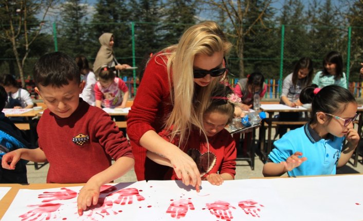 Sebze ve meyvelerden elde ettikleri doğal boyalarla okul bahçesinde resim yapan minik öğrenciler, eserlerini okul duvarına astı.