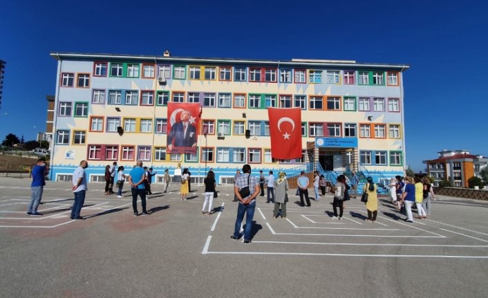 Saygı duruşu ve İstiklal Marşı'nın okunmasının ardından öğretmenler, sosyal mesafe kuralına uyarak okula giriş yaptı.
