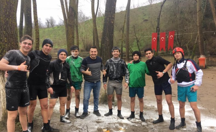 Sabah saatlerinde Melen Çayı çevresinde buluşan 8 kişilik Düzce Rafting Team sporcuları, soğuk suya ve azgın dalgalara karşı kürek çektikten sonra takım arkadaşları Aykut Özbek için doğum günü sürprizi hazırladı.