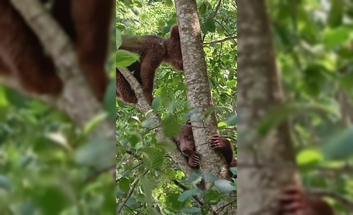 Köyde yaşayan Rıfat Yazıcı, ağaçta gördüğü ayı yavrularını cep telefonuyla kaydetti.