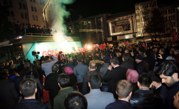 Karaaslan, Demir'in kesin olmayan sonuçlara göre Belediye Başkanlığına seçilmesinin ardından Cumhuriyet Meydanı'nda düzenlenen kutlama programına katıldı.
