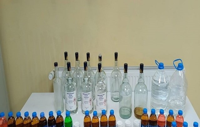 Zanlının iş yerinde ve aracında yapılan aramada, 47 litre sahte içki, 26 litre etil alkol, içki yapımında kullanılan 2 litre "kit" olarak tabir edilen gıda aroması ele geçirildi.