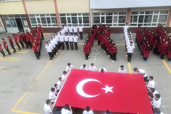 Koreografide 100 öğrenci kırmızı beyaz giysi giyinerek, okul bahçesinde bir araya geldi.