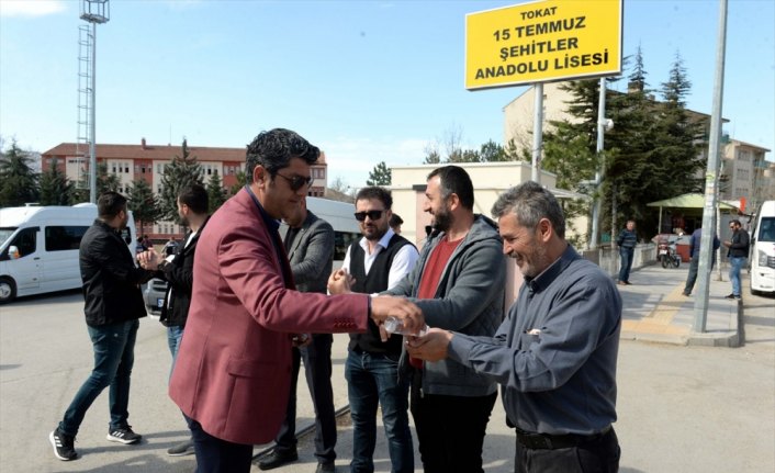 TOKAT (AA) - Tokat'ta bir mahalle muhtarı, yeni tip koronavirüsten (Kovit-19) korunmaya dikkat çekmek için okuldan çıkan lise öğrencilerine kolonya ikram etti.