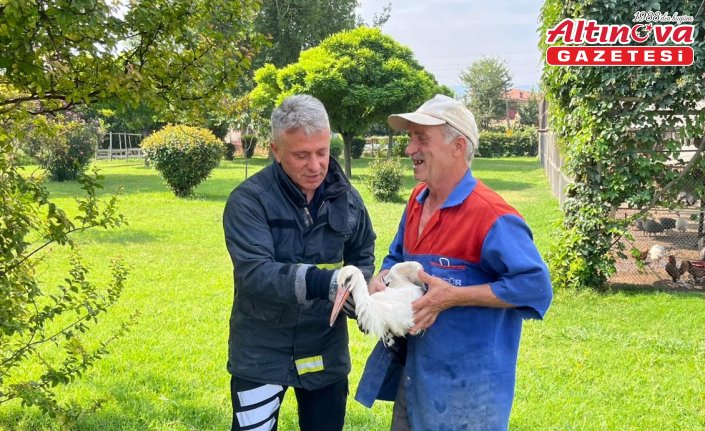 Bu sırada hareket eden leylek, yaklaşık 3 metre yükseklikten düşerken itfaiye görevlisi leyleği havada yakaladı.