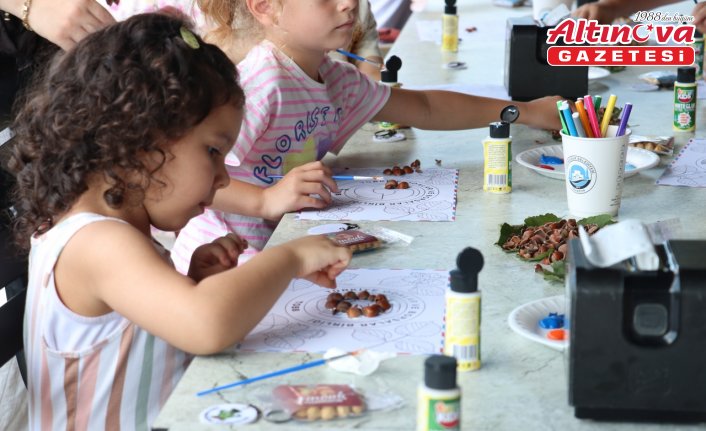 Volkan Konak Seyir Terası'nda düzenlenen etkinliğe aileleriyle birlikte katılan çocuklar, fındık kabuğu ve yapraklarını kullanarak kabartmalı resimler yaptı.