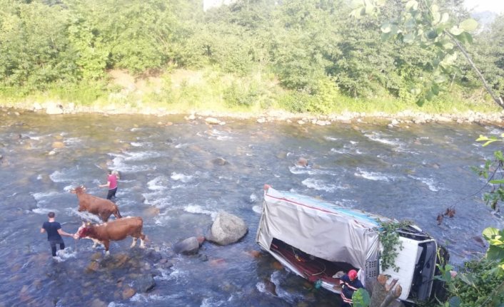 TRABZON (AA) - Trabzon'un Of ilçesinde büyükbaş hayvan taşıyan kamyonun dereye devrilmesi sonucu sürücü yaralandı.