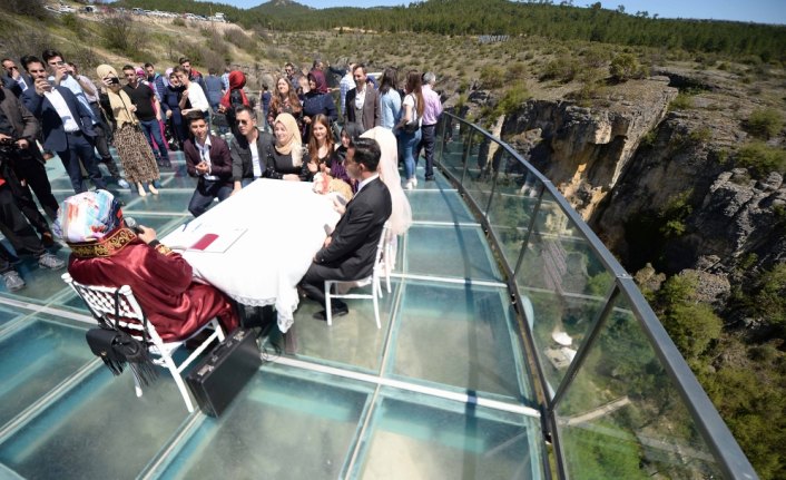 KARABÜK (AA) - UNESCO Dünya Kültür Mirası Listesi'ndeki tarihi evleriyle ünlü Karabük'ün Safranbolu ilçesinde bir kanyon üzerinde 80 metre yükseklikte bulunan cam seyir terasında, nikah töreni gerçekleştirildi.