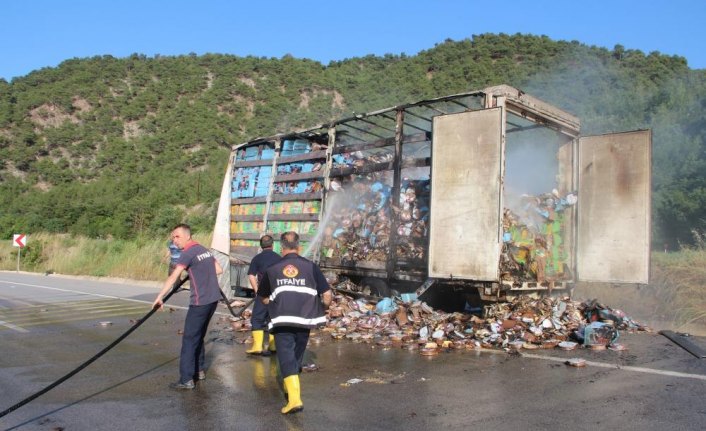 AMASYA (AA) - Amasya'nın Taşova ilçesinde yangın çıkan tırın dorsesinde bulunan ürünler, kullanılamaz hale geldi.