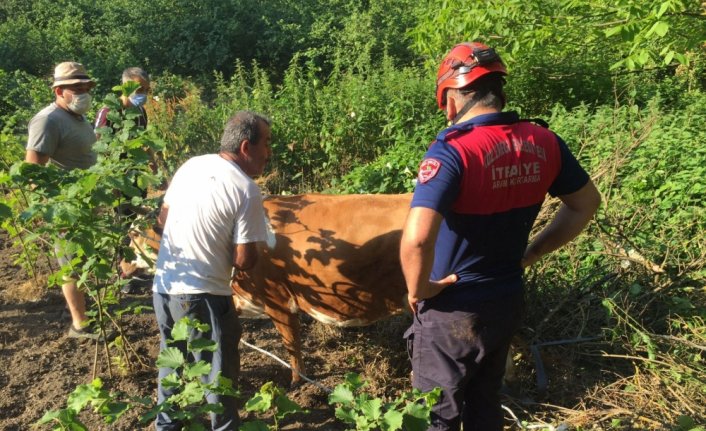 Bulunduğu yerden vinç yardımıyla kurtarılan inek, sahibine teslim edildi.