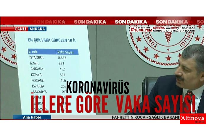 Sağlık Bakanı Fahrettin Koca: "İstanbul'daki vaka sayısı 8,852'dir. İzmir'de 853 vaka, Ankara 712, Konya 584, Kocaeli 410, Isparta 268, Sakarya 207, Adana 197, Bursa 135, Samsun 112 vaka. En çok vaka görülen illerimizdir."