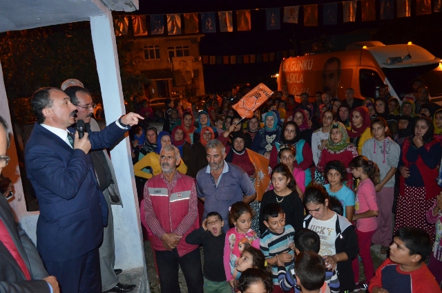 “ 1 Kasım seçimlerinde milletimizin kararının AK partinin tek başına iktidarı olacağına inanıyoruz. Yaptığımız çalışmalarda halkımızdan bunun güçlü işaretlerini görüyoruz. Ak parti olarak 13 yıldır hangi sözleri verdiysek çok şükür tuttuk. Hangi vaatlerle halkımızın karşınıza geldiysek onları yerine getirdik. Milletimizin desteğini aldık.  Başbakanımızın açıkladığı seçim beyannamemiz ise toplumumuzun tüm kesimlerine hitap ediyor. Her zaman ihtiyaçlar değişir. Hizmetlerin çıtası yükselir. AK parti olarak bunları dikkate alıyor ve çıtayı ülkemizin imkânları ölçüsünde yükseltiyoruz.  1 Kasım seçimlerinden sonra Taşeronluk çerçevesinde kamunun ihtiyaç duyduğu işlerde çalışan taşeronları kamuda istihdam etmeye başlayacağız. Esnafımıza 30 bin TL’ye kadar faizsiz kredi desteği vereceğiz.  İş kuran gençlerimize karşılıksız 50 bin TL verilecek, 100 bin liraya kadarda faizsiz kredi imkânı sağlayacak ve gençlerimizin iş kurmalarını destekleyeceğiz. Emeklilerimize her ay 100 TL fark ödeyeceğiz. Yılda 1200 TL imkân sağlayacağız. Emekli olduktan sonra iş yapan emeklilerimizden kesilen % 15 kesintiyi % 10 ‘a düşürmüştük. 1 Kasımdan sonra tamamını kaldıracağız. Yemde ve gübrede KDV’yi kaldırıyoruz.  Genç çiftçilerimize proje karşılığı 30 bin lira karşılıksız destek vereceğiz. Sera modernizasyonları için faizsiz kredi vereceğiz. Asgari ücret ise; 1300 TL olacak. Milletimizin istikrar içinde kalkınması devam edecek. AK Parti olarak tutamayacağımız hiçbir sözü vermedik, verdiğimiz sözleri ise Allah’a şükür tuttuk. Bundan sonra tutmaya devam edeceğiz. Milletimizin desteği ile AK Partinin Tek başına iş başına geleceğine inanıyoruz. “