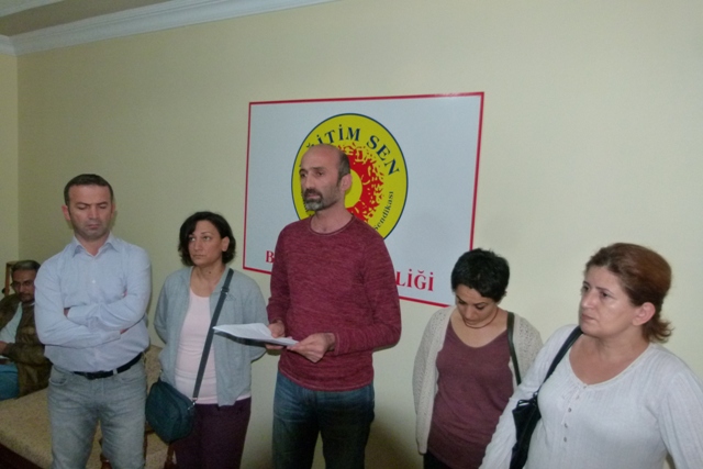 Eğitim-Sen Bafra Temsilcisi Tacettin Koca, sendika binasında basın açıklaması yaptı.
