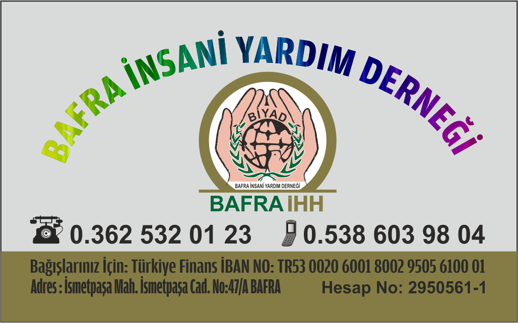 Bafra İnsani Yardım Derneği( BİYAD) Başkanı İlyas Altuntaş ”Reyhanlıdaki İHH’nın fırınında üretilen ekmekler Suriye içlerine kadar ulaştırılmakta, ekmek üretimi için çok miktarda una ihtiyaç duymaktayız. İhtiyaçlarımızı genelde gönüllü Türk halkı karşılamaktadır. Şuan depolarımız da, un stokumuz tükenmek üzeredir. Çok acil una ihtiyaç duymaktayız. Bir çuval un bedeli 60 TL’dir. Vatandaşlarımızın derneğimize ulaşması veya internet üzerinden Türkiye Finans Bankası Bafra Şubesi 2950561-1nolu hesap’a veya IBAN No: TR53 0020 6001 8002 9505 6100 01 nolu hesaplara un bedeli belirterek, yardım yapılabilir. Halkımıza duyarlılığı için şimdiden teşekkür ediyorum” diye konuştu.