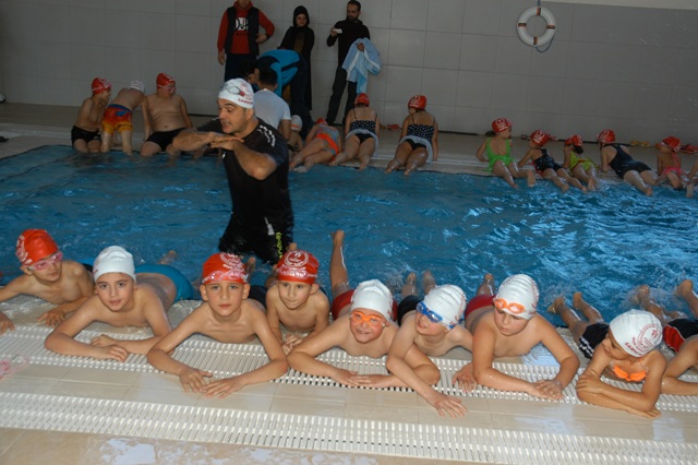 Pazartesi günleri hariç haftanın 6 günü saat 10.00-11.00, 13.00-14.00, 14.30-15.30 saatleri arasında ‘Sevgiyle Uzanan Eller Projesi’ kapsamında bulunan öğrenciler, 3 grup halinde yüzmeyi öğrenecek.