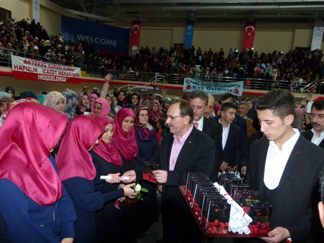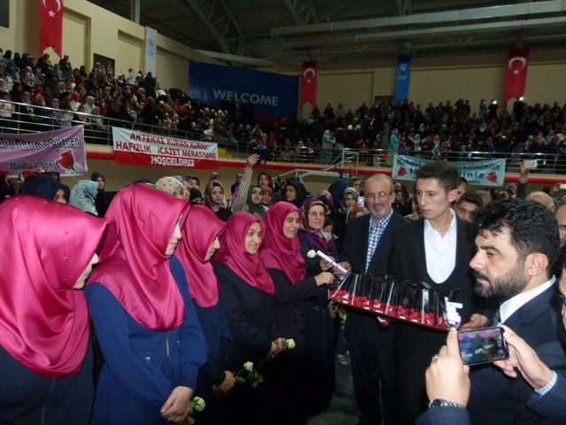 Samsun il Müftüsü Veysel Çakı ise, “Kur’an-ı Kerimi baştan sona ezberlemiş, adeta yürüyen ve yaşayan Kur’an olmuş hafızlarımıza, hafızlık tacını giydirmek üzere toplanmış bulunuyoruz. Hafızlık İslam dininde ve müslüman toplumlarında, çok önemli bir mertebedir. Kur’an Kurslarımızda çok önemli bir din eğitimi veren en önemli bir müessesemiz den birisidir. Kur’an-ı Kerimi hayatımıza yansıtmak mecburiyetindeyiz. Kur’an-ı Kerimi okumak, okutmak, öğrenmek, öğretmek ve yaşatma görevimiz vardır. Bugün ülkemizde 100 bine yakın Kur’an Kursu vardır. Onların %90’ında kız öğrencilerimiz,%10’unda da erkek öğrencimiz eğitim görmektedir. Hafızlık önemli bir mertebe olduğu kadar, Allah katında önemlidir. Hafız olmak zor olduğu kadar, hafızlığı devam ettirmek, hafızlığı sürdürmek o kadar zordur. Hafız olduktan sonra tekrar ettiği sürede çok kısa sürede çok kısa sürede unutulmaktadır. Hafızların anne ve babaları, ben inanıyorum ki; siz çocuklarınız kadar mutlusunuz. Hafız olan birinin annesi olmak, hafız olan birinin babası olmak bir ayrıcalıktır. Sizi tebrik ediyorum” diye konuştu.