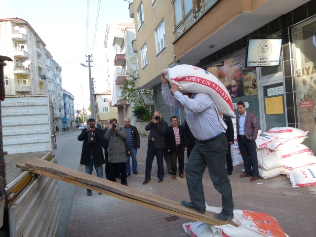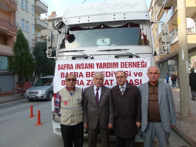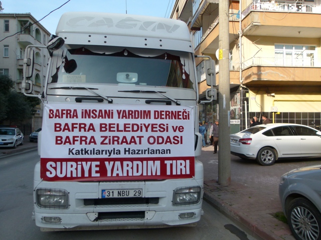 Bafra Belediyesi, Bafra Ziraat Odası, Bafra İnsani Yardım Derneği ve Eğitim-Bir-Sen Bafra Şubesinin hazırladığı un ve kuru gıda 1 TIR, savaş mağduru halka ulaştırılmak üzere Suriye’ye gönderildi.