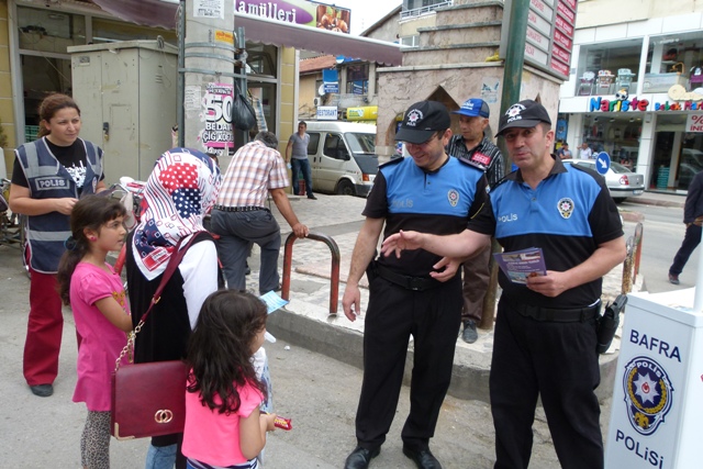 Bafra Toplum Destekli Polis ekipleri çocuklara ve ailelere boğulmalara karşı alınacak tedbirlerle ilgili broşür dağıttı.