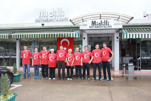 Son bir ay içinde Ülkemizde 125'e yakın Asker ve Polisin PKK'lı teröristler tarafından Şehit edilgini belirten Midilli Restotant İşletme Müdürü Haluk Marangoz.” Personelimize Ay Yıldızlı  tişörtü gidererek terörü lanetledik ve bu arada Şehit olan Mehmetçiklerimiz ile Polislerimizi rahmet anıyoruz geride kalan gözü ailelerine Allah’tan sabırlar diliyorum. Şehitler vurulunca değil unutulunca ölür. Hiç bir zaman unutmadık ve unutmayacağız. Hep içimizde yaşatıyoruz" diye konuştu.