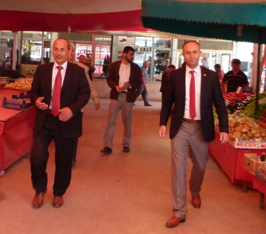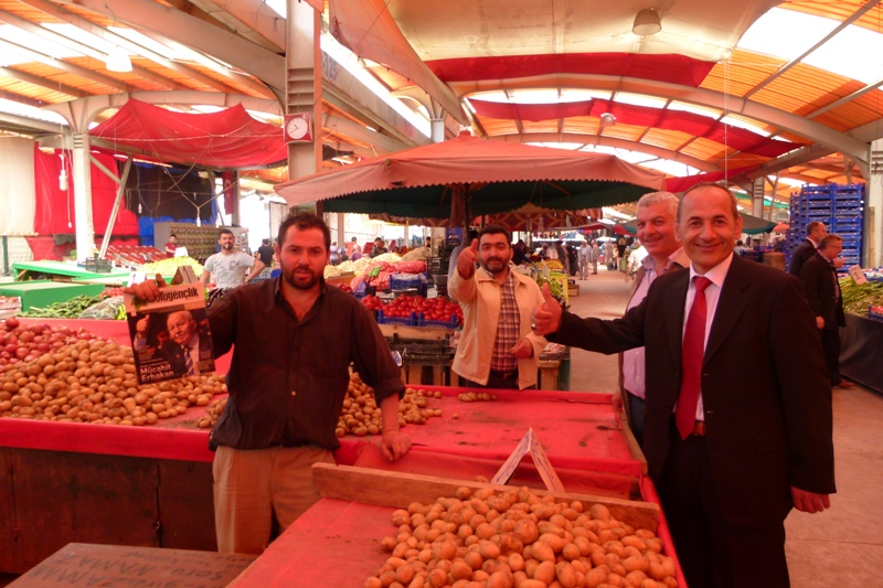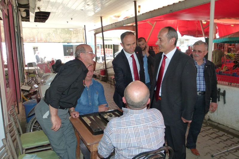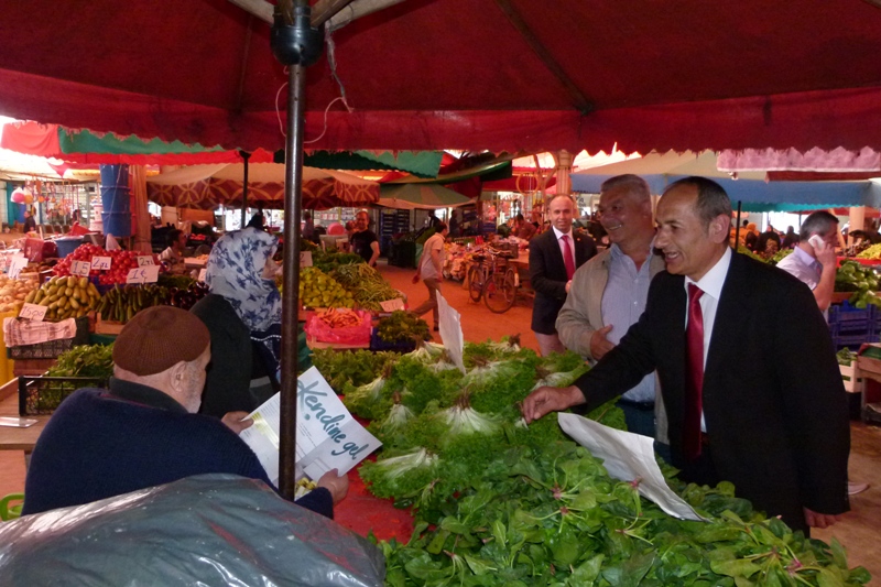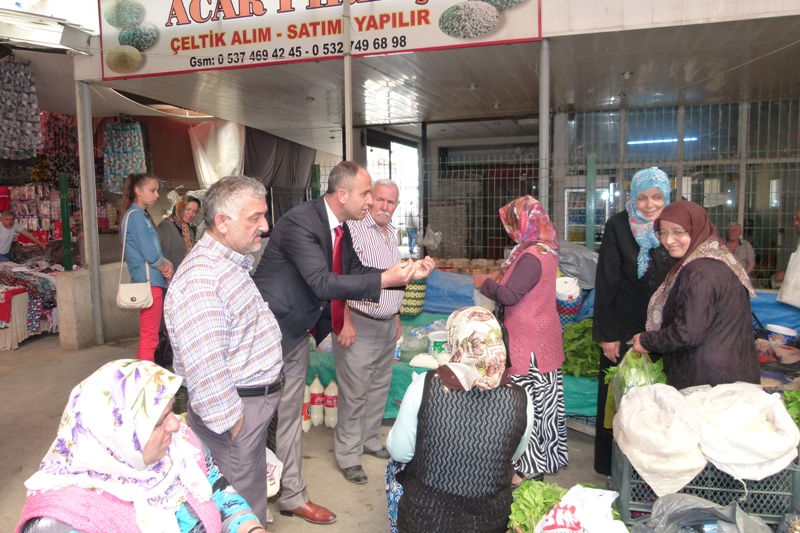 Pazar esnafı ile sohbet eden ve SP'nin seçim broşürlerini dağıtan SP Samsun Milletvekili adayları Turhan Bayraktar ve Bilal Arslan ilgi yoğundu.