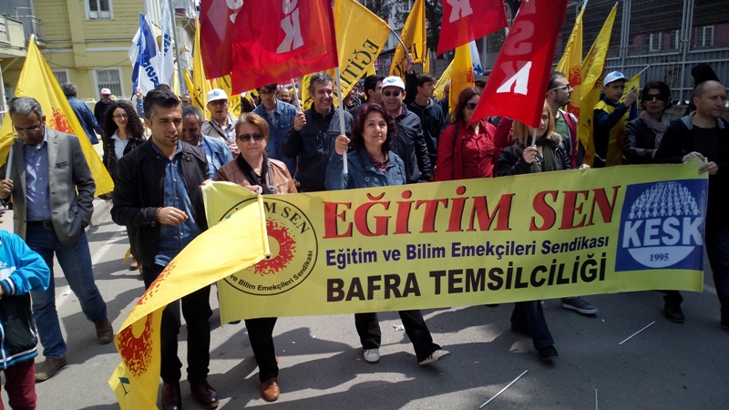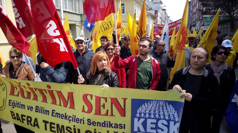 Samsunda demokratik kitle örgütlerinin toplanma alanı olan TCDD Ray Apartmanı önüne gelen Bafralı eğitim emekçileri, Bafra Eğitim Sen Temsilciliği pankartı arkasında toplandılar. Saat 13:30 da yürüyüşe geçen eğitim emekçileri, yürüyüş güzergahı boyunca attıkları sloganlar eşliğinde Cumhuriyet Meydanında yapılan 1 Mayıs Kutlama alanına ulaştılar.