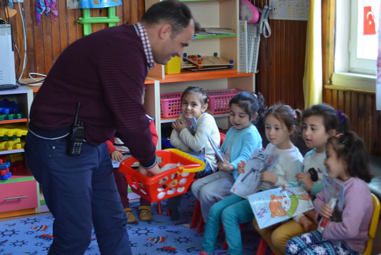 Gazi Anaokulu'nu ziyaret eden polisler, minik öğrencilerle sohbet edip öğrencilere boyama defteri ile yapboz ve boyama kalemleri hediye etti, çevredeki tehlikelere karşı bilgilendirme yaptı.