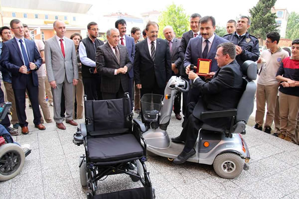 Akülü engelli arabası Okulun bahçesinde düzenlenen törenle Sakatlar Derneği Bafra Şube başkanı Recep Köksal’a teslim edildi. Dernek adına başkan Recep Köksal Okul Müdürü Ömer Demirkol’a günün anısına ve destekleri nedeni ile plaket verdi.