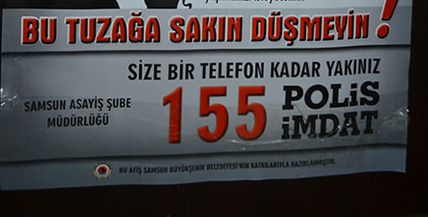 "T.C. Samsun Valiliği İl Emniyet Müdürlüğü hazırlamış olduğu afişte; arayan şahıs kendini polis, asker, veya savcı olarak tanıtıp sizlere telefon görüşmeniz esnasında telsiz dinletip kimlik bilgilerinizin, banka hesap numaralarınızın ve telefon numaralarınızın terör örgütleri tarafından kullanıldığını söyleyerek, sizleri korku ve paniğe sevk edip sizden değerli ziynet eşyalarınızı, paranızı yanınıza gelecek şahsa teslim etmenizi yada paranızı verecekleri hesap numarasına havale yapmanı isteyecektir."