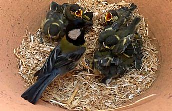 "Büyük baştankara" kuşunun saksıdaki yavrularını beslediği anlar kamerada