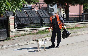 Peşinden ayrılmayan oğlağıyla cadde ve sokakları temizliyor