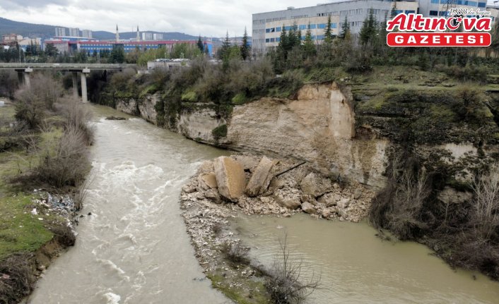 Karabük'te yamaçtan kopan kaya parçaları çaya düştü.