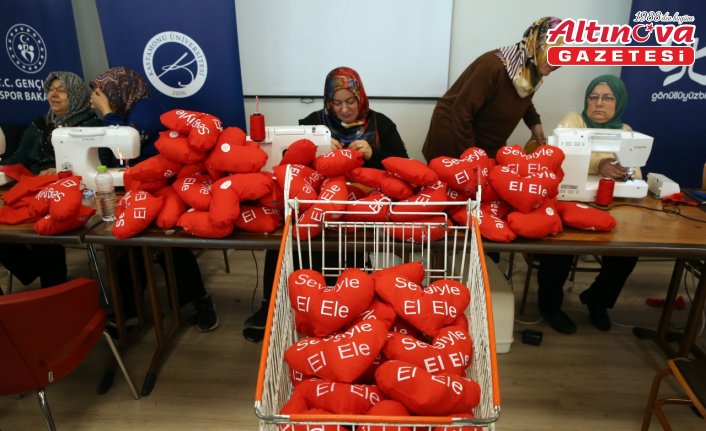 Proje kapsamında yaklaşık 100 kişi, Özel Bireyler ve Aileleri Dayanışma Derneğinin hediye olarak verdiği "sevgiyle el ele" yastıklarını dikti.