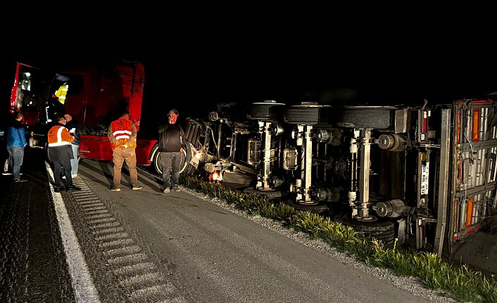 Samsun-Ankara kara yolu Hacılı Geçidi mevkisinde H.B. idaresindeki 01 ATY 920 plakalı yonca yüklü tır şarampole devrildi.
