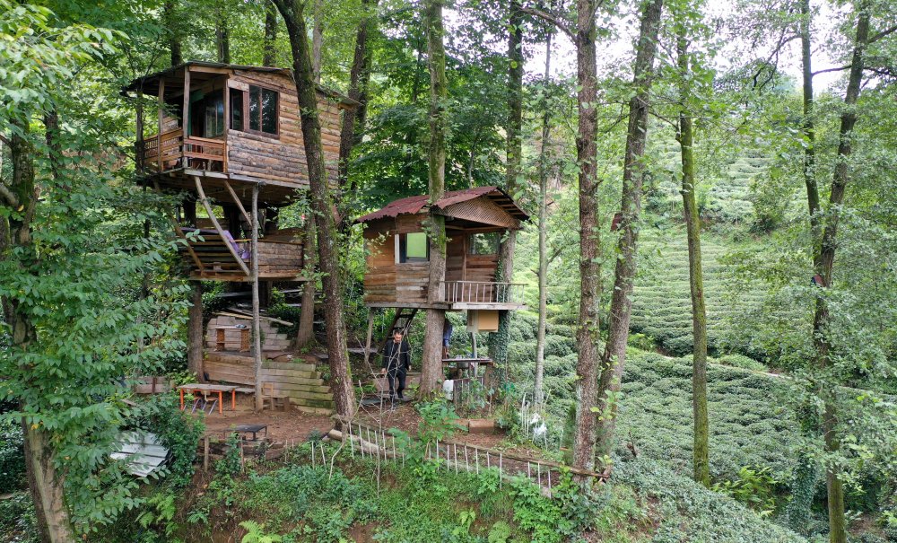Rize'nin Kalkandere ilçesinde yaşayan Murat Aksoy, babası ve kardeşinin yardımıyla kızılağaçların gövdeleri arasına yaptığı, güneş panelleriyle ışıklandırıp çeşitli eşyalarla döşediği ahşap evlerde yakınlarını ağırlıyor.