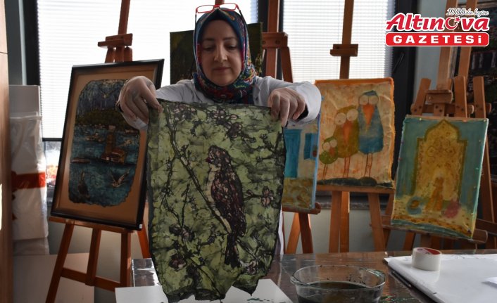 Trabzon'da görsel sanatlar öğretmeni Gülcan Eroğlu, ipek kumaşlar üzerine çizdiği çeşitli figürleri balmumu ve kök boyayla buluşturuyor.